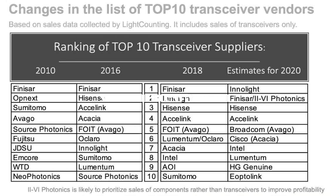 C114訊 4月7日消息(水易)2020年初,知名光通信市場(chǎng)調(diào)研機(jī)構(gòu)LightCounting發(fā)布一份報(bào)告指出,中國(guó)的光模塊供應(yīng)商將在2020年主導(dǎo)全球市場(chǎng),市場(chǎng)占比將超過(guò)50%。同時(shí),這一年將首次出現(xiàn)5家中國(guó)廠商同時(shí)進(jìn)入全球前十,分別是旭創(chuàng)、海信、光迅、華工正源和新易盛,而2010年只有一家。此外,旭創(chuàng)可能會(huì)在2020年占據(jù)第一的位置,就此終結(jié)Finisar的“連冠”記錄。